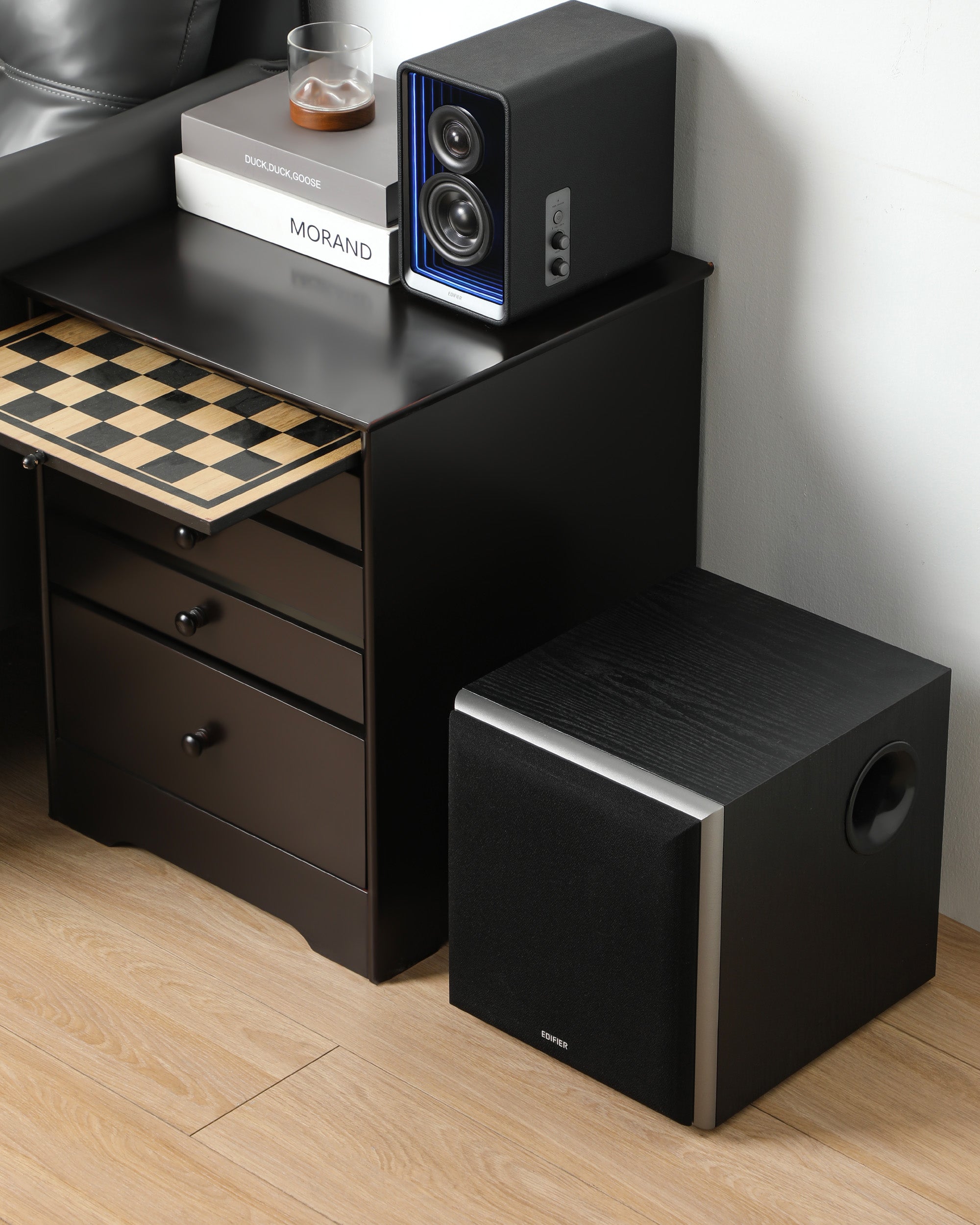 - Wood-grain MDF enclosure blends naturally with modern interiors